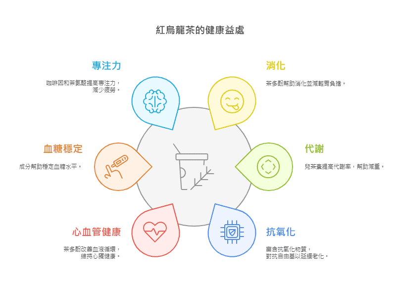 紅烏龍茶含有豐富的茶多酚與咖啡因,這些成分能夠幫助刺激腸胃蠕動,促進消化,特別適合在油膩餐後飲用。